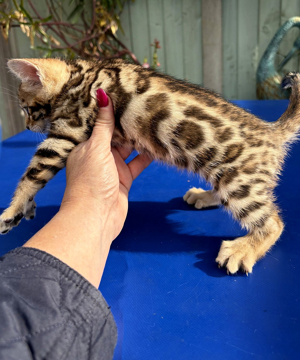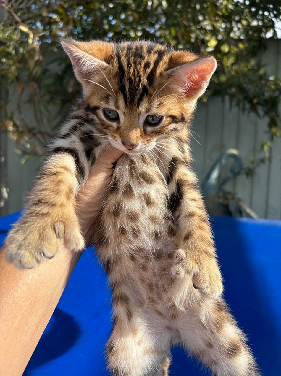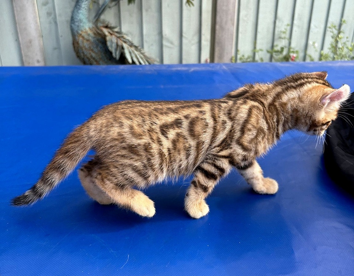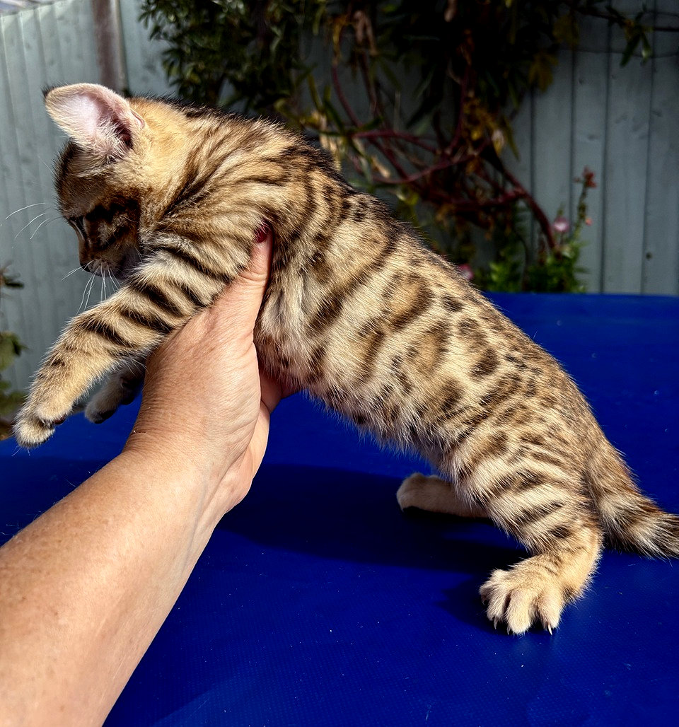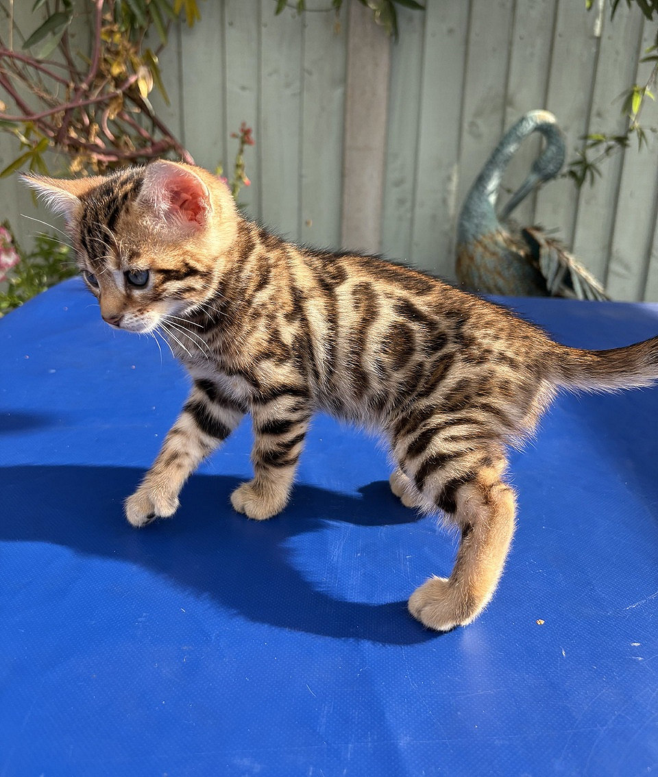 This boy  is just breath taking. Absolutely top quality golden rosetted Keetso. He is polydactyl and he has a beautiful wild looking head and also funky head markings, stunning long face and big nose and muzzle. He is a  big chunky boy and will become even more spectacular as he grows into an adult.  Fabulous personality and bags of character. A boy of this quality is extemely rare, he really looks like a wild cat. - £3595 -available