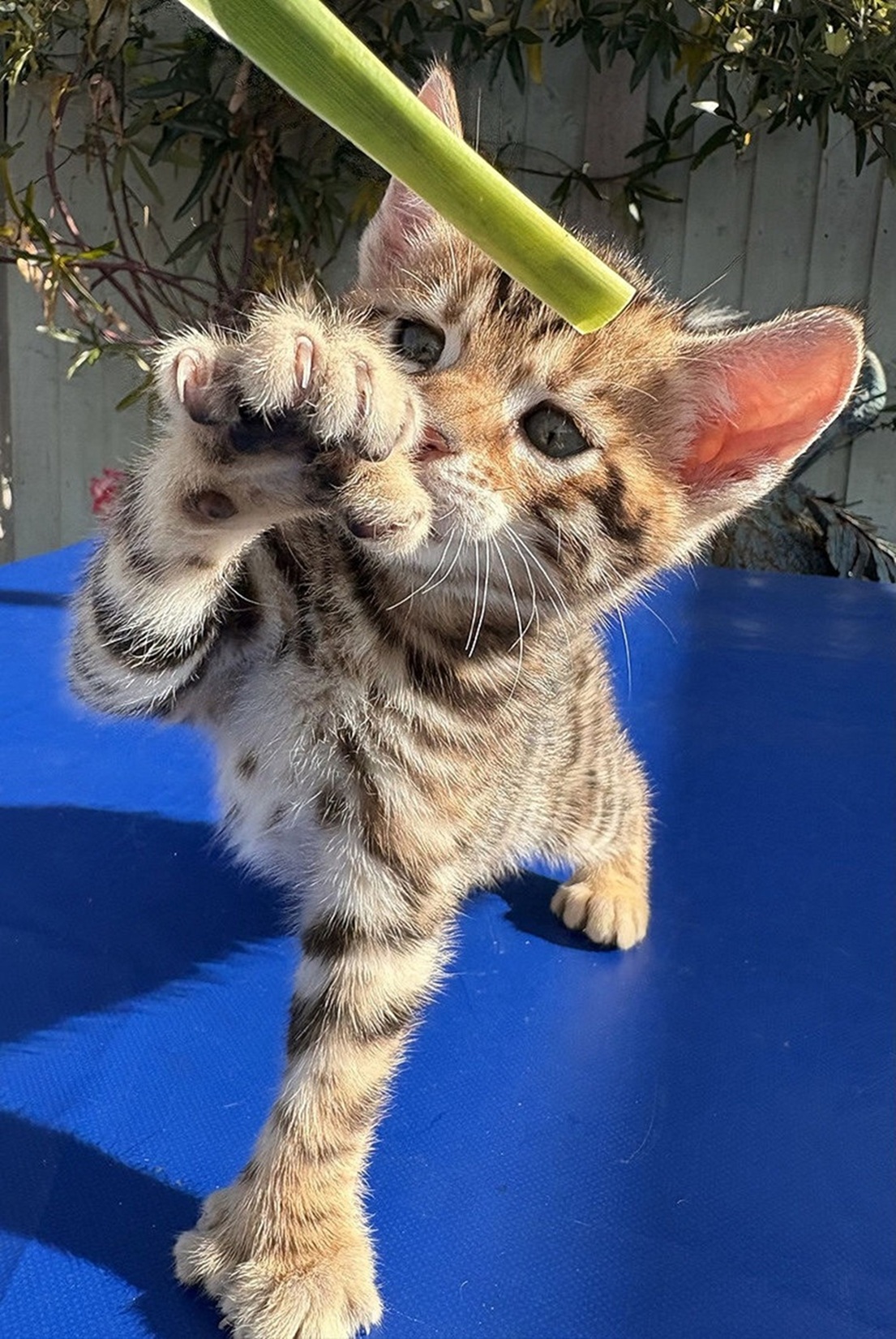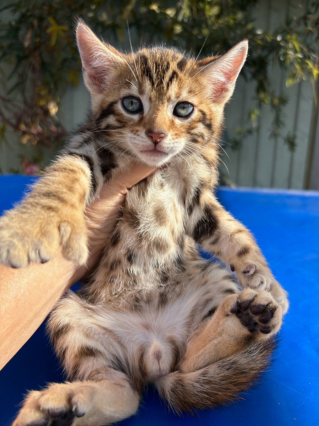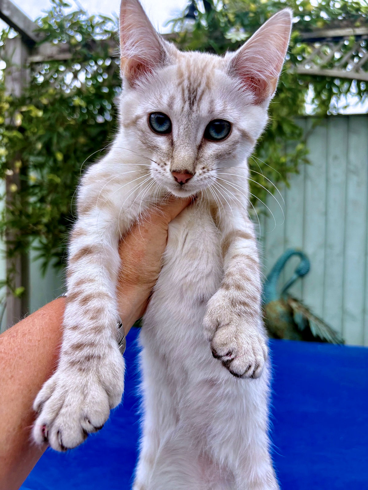 There is so much I could say about this amazing boy, he is the best Keetso I have ever produced. He is a polydactyl curled eared snow leopard    rosetted  male. He  has a gorgeous wild looking head. big polydactyl feet, lovely curled ears and beautiful markings and he will become even more spectacular as he grows into an adult.  Fabulous  loving personality and bags of character. A  boy of this quality is extremely rare..reserved for Claire and familyT