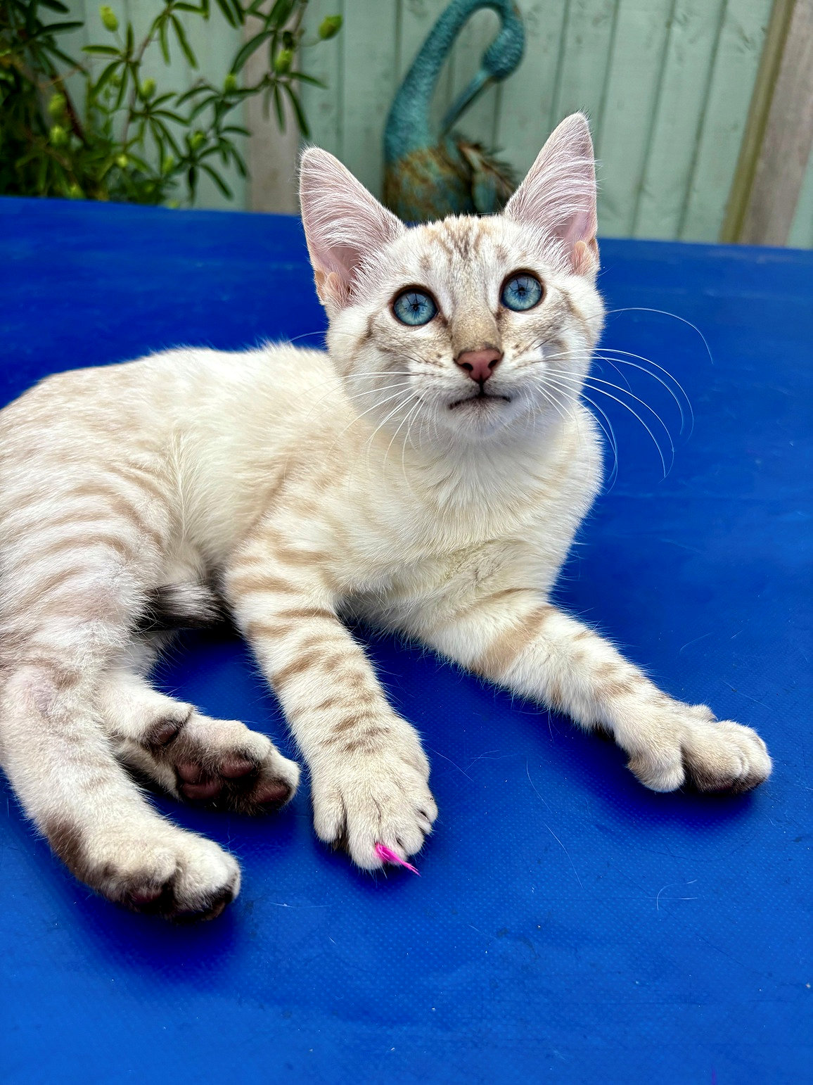This superb boy is a real chunk. He is a flame pointed Keetso. He is polydactyl 4x4 with curled ears,  has a stunning wild looking head. He  has the most amazing blue eyes they look like sapphires, just incredible. Fabulous personality and bags of character, £3595 - reserved for Toby